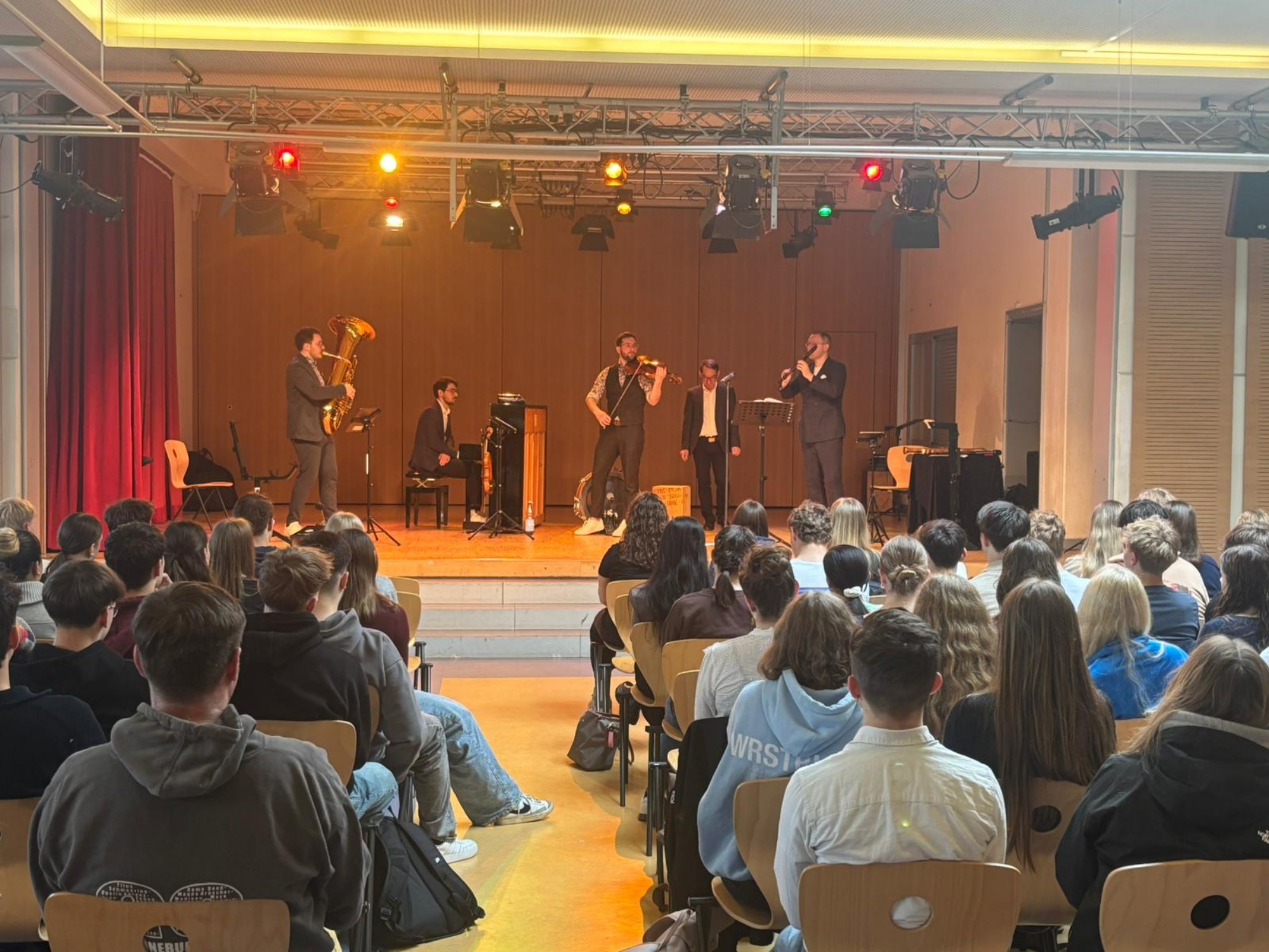 Schüler*innen erleben live das Zusammenspiel von Lesung und Musik und spüren dabei die Atmosphäre eines „echten“ Auftritts der Künstler*innen und Schauspieler*innen. So wird aus einer Probe ein lebendiger Ort der Vermittlung, in der wir Teilhabe ermöglichen und den Zugang zu Kultur dort schaffen, wo junge Menschen täglich zusammenkommen. Am Ende der Probe haben Schüler*innen die Möglichkeit, Fragen zu stellen– auch in Bezug auf die Nachhaltigkeitsstrategie, die wir im Rahmen unseres Festivals verfolgen.